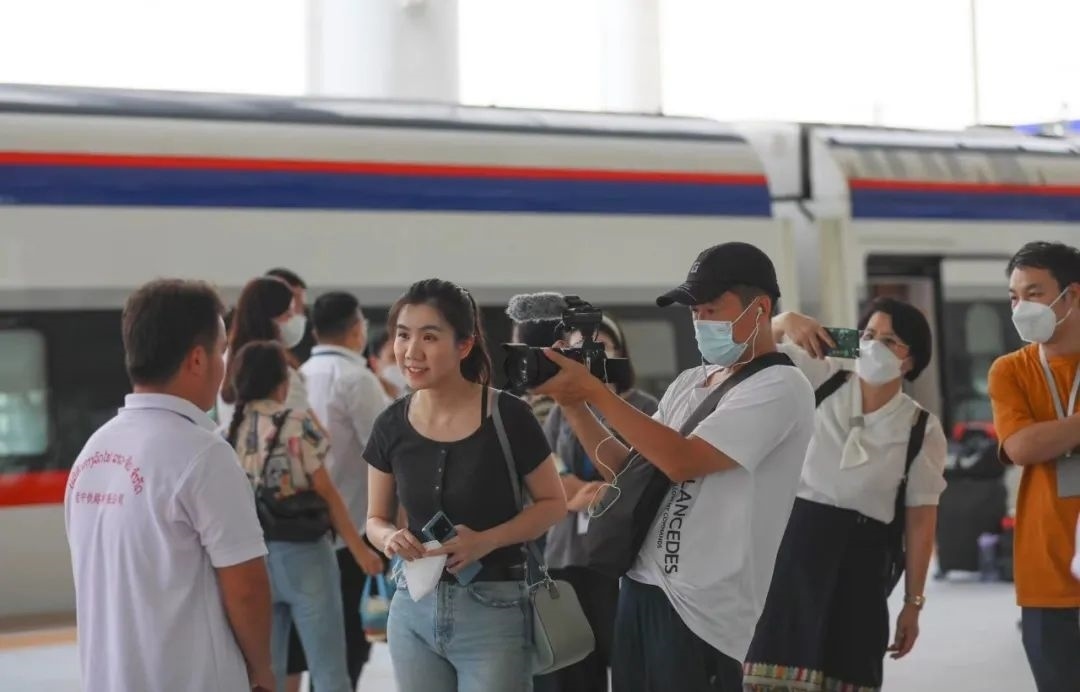 比如,專訪老撾國家主席通倫的節(jié)目中,主持人鄒韻在中老鐵路“瀾滄號”動車上采訪當(dāng)?shù)芈每?,車窗外鐵路沿線風(fēng)光萬千,總臺出品的歌曲《坐著火車去老撾》活潑輕盈,各國乘客用最真實的出行體驗,生動展現(xiàn)了跨越山河、聯(lián)結(jié)友誼的中老鐵路,是共建“一帶一路”取得的實打?qū)嵉某删汀?/p>