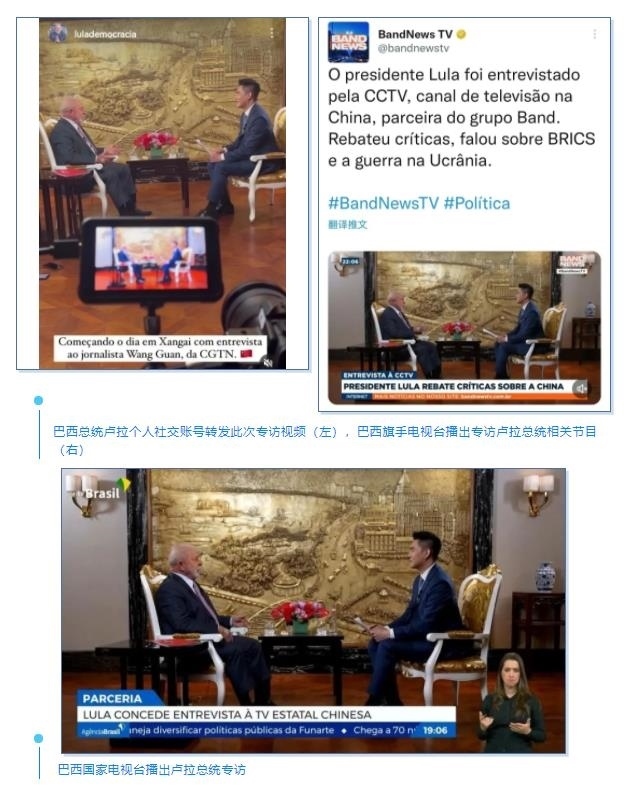 盧拉總統(tǒng)在其個人社交賬號轉(zhuǎn)發(fā)此次專訪視頻。巴西第二大電視臺旗手電視臺綜合頻道,在當(dāng)?shù)貢r間4月14日晚率先播出總臺《高端訪談》專訪盧拉總統(tǒng)的精華版,觸達(dá)巴西全境,完整版專訪于次日在該臺各頻道多次播出。巴西最大新聞門戶網(wǎng)站UOL、知名雜志《論壇》等也陸續(xù)上線本次專訪節(jié)目。