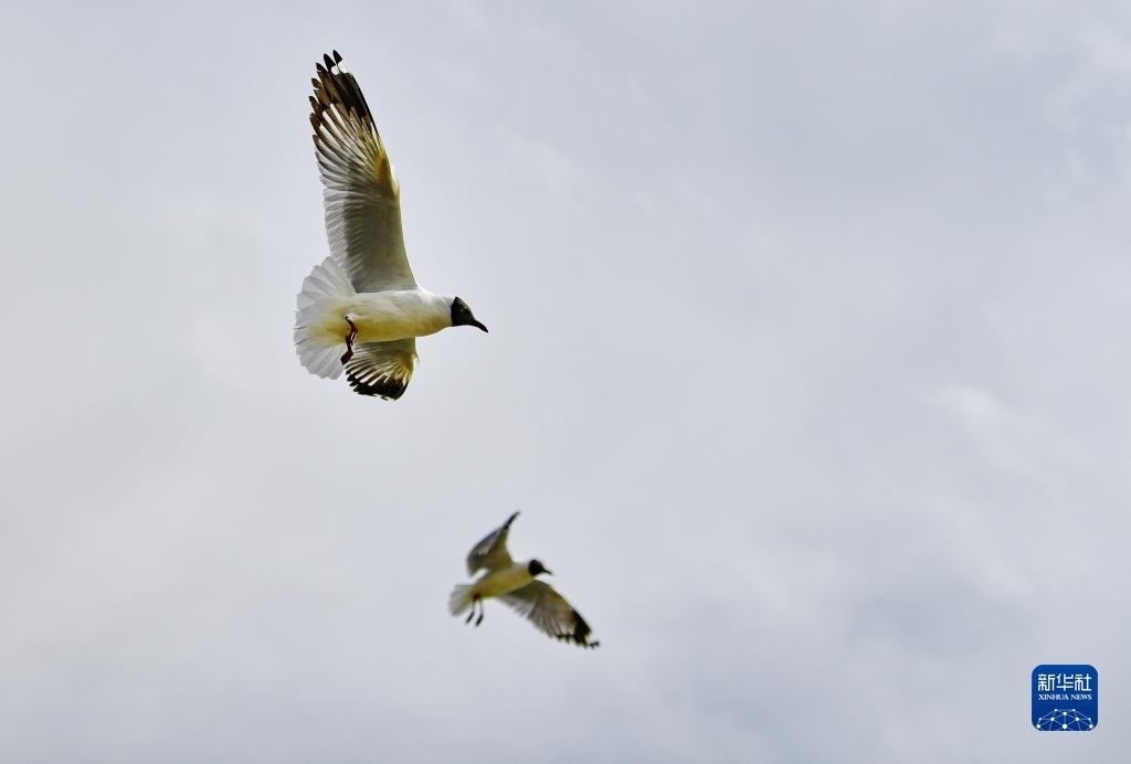棕頭鷗在拉薩河上空翱翔(4月16日攝)。