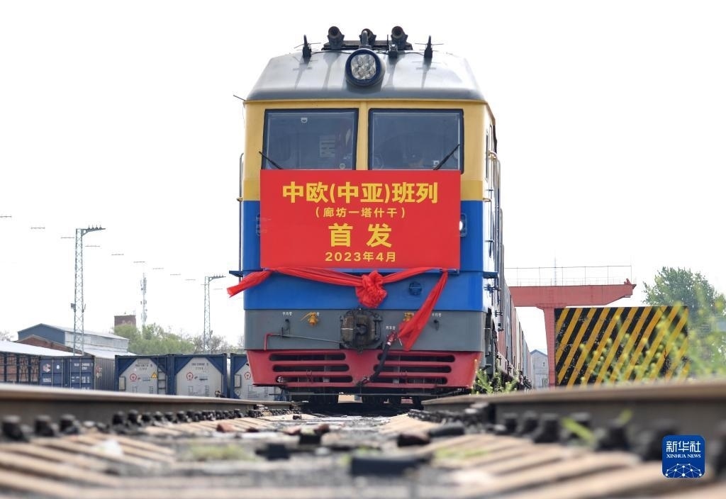 當日,河北省廊坊市正式開通中歐(中亞)班列(廊坊——塔什干)。首列開行的集裝箱班列編組55輛,由廊坊北鐵路貨場始發(fā),經霍爾果斯口岸出境,途經哈薩克斯坦,最終抵達烏茲別克斯坦塔什干,全程約6000公里,預計運行時間約15天,貨物總重量1400余噸,主要包括保溫管、機械設備、型材等。新華社發(fā)(劉向攝)
