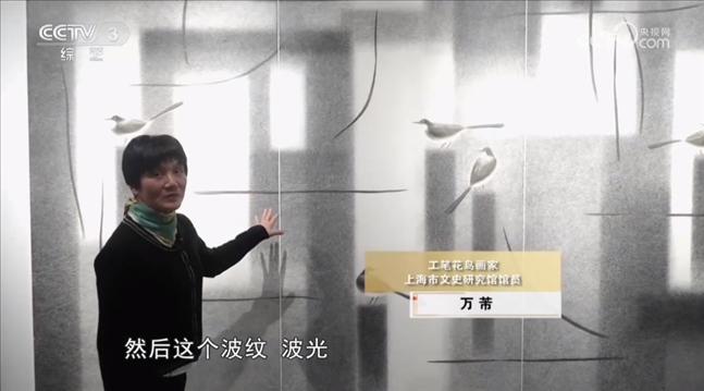工筆花鳥畫家 上海市文史研究館館員 萬芾:我們看到水泥柱子嘛,方的,這個波紋我是用山水畫里的披麻皴的皴法,形成水光瀲滟的效果,畫面也是用了一個比較抽象的點線面的元素來處理的,追求還是中國傳統(tǒng)繪畫里的氣韻生動,只是整個畫面第一感覺的形式讓人現(xiàn)代的感覺。