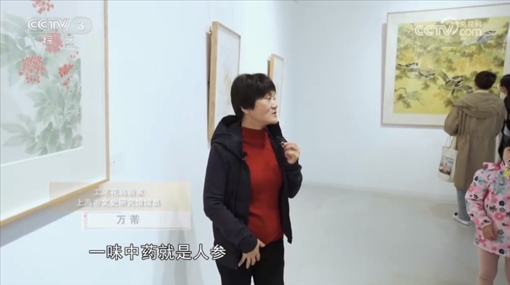 工筆花鳥畫家 上海市文史研究館館員 萬芾:我們看看這幅,這幅應(yīng)該我們很熟悉的一味中藥材就是人參,看了中藥這么美麗的花,這么有生命力的現(xiàn)象,是不是我們吃的時候也不苦了。