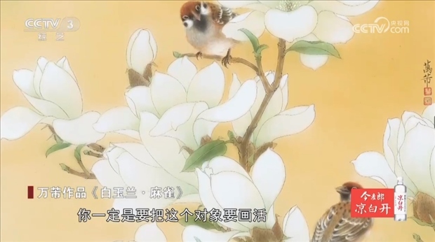 工筆花鳥畫家 上海市文史研究館館員 萬芾:這個鳥我就覺得挺可愛,它就是這樣的,童花頭,眼神是我自己擬人化的,因為鳥從一出生你來養(yǎng),她就把你當媽媽了,我畫畫時就飛到我肩膀上,我們畫花鳥的畫家和畫人物畫家一樣的,你一定是要把這個對象要畫活。