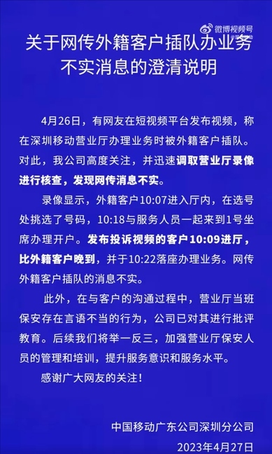 ·深圳移動(dòng)否認(rèn)“外籍客戶插隊(duì)”:調(diào)錄像核查,發(fā)布投訴視頻的客戶晚到。
