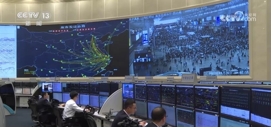總臺(tái)央視記者 鄭連凱:在調(diào)度大廳的屏幕上,我們可以實(shí)時(shí)看到包括剛剛采訪的虹橋站在內(nèi),整個(gè)長(zhǎng)三角地區(qū)740多座車站的客流情況,以及13000多公里鐵路線上列車的運(yùn)行狀態(tài)。而這張圖顯示的是從長(zhǎng)三角連通全國(guó)各地的干線鐵路的繁忙程度,其中紅色的京滬、滬漢榮、滬昆代表著最繁忙,這里的工作人員可以根據(jù)客票需求隨時(shí)調(diào)度,增開臨客列車。