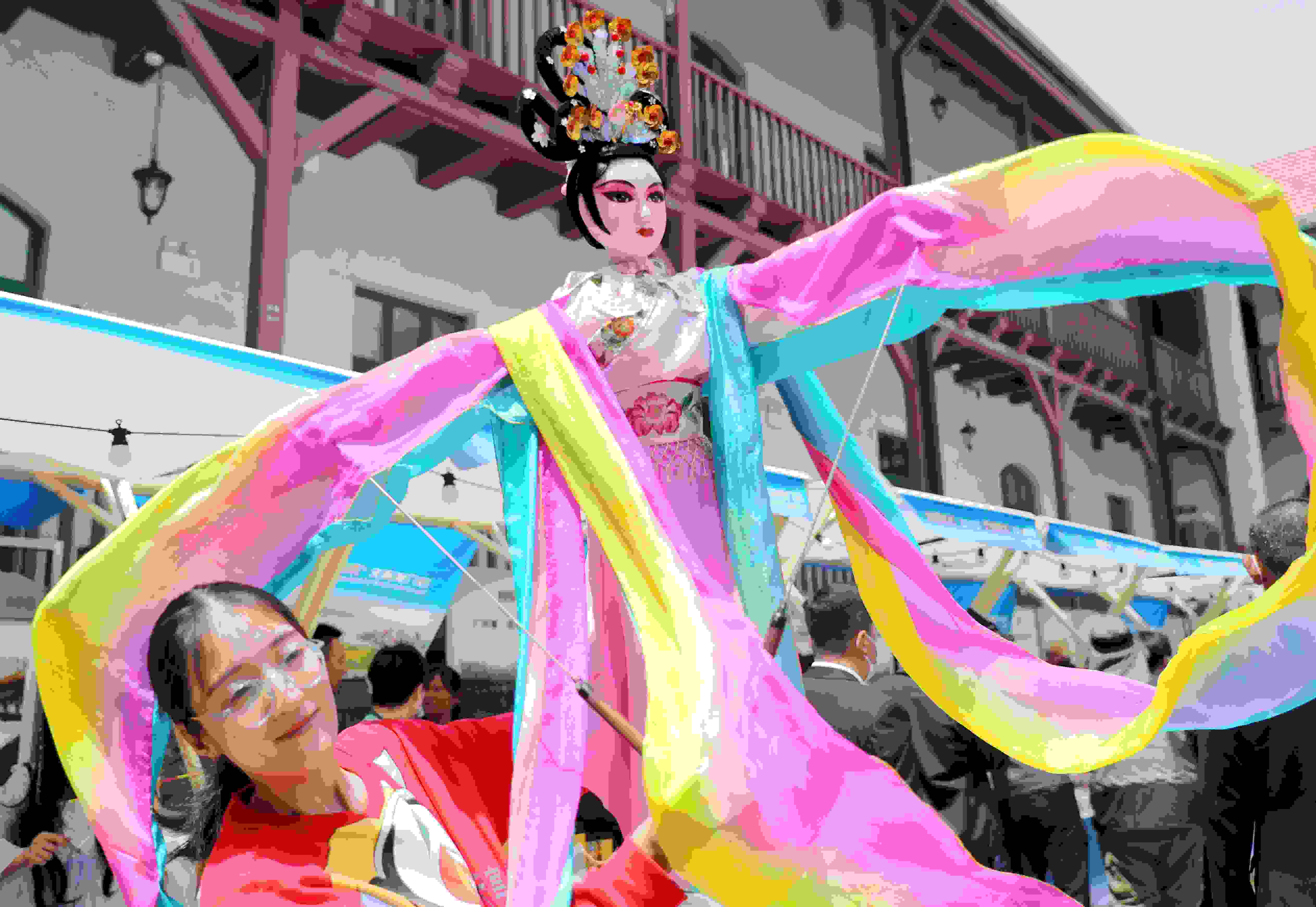 4月30日,山東萊西木偶藝術(shù)團(tuán)的演員在給游人們展示木偶戲的表演技巧。 張進(jìn)剛 攝