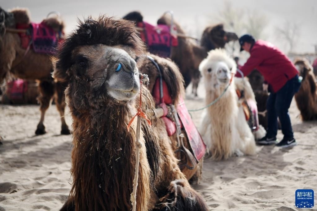 曹文華牽著駱駝在鳴沙山月牙泉景區(qū)駱駝騎乘點等待游客(4月24日攝)。