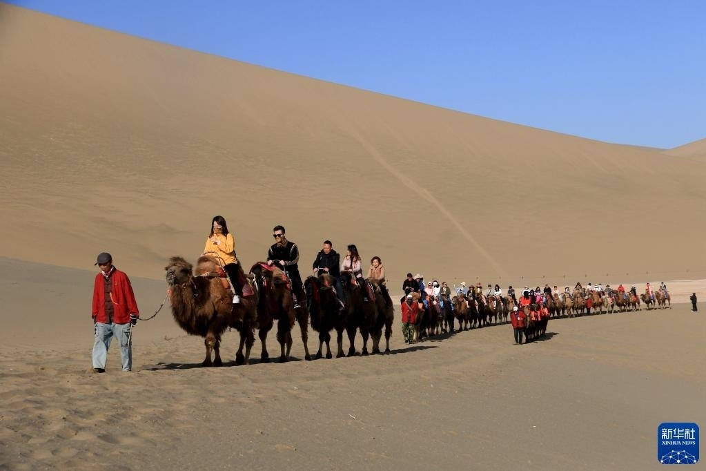 曹文華和他的駝隊載著游客行走在鳴沙山月牙泉景區(qū)的駝道上(4月24日攝)。