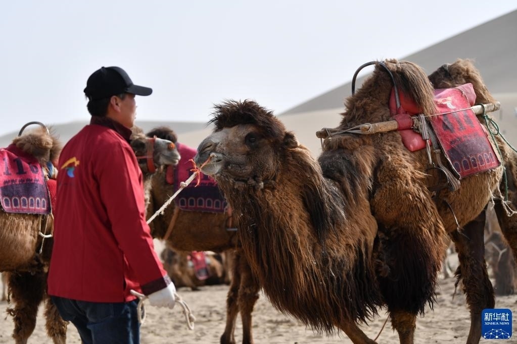 曹文華準備牽駱駝前往鳴沙山月牙泉景區(qū)(4月24日攝)。