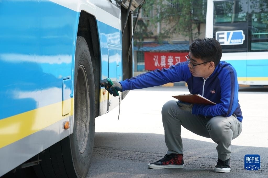 5月1日,在位于北京市朝陽區(qū)的柳芳公交場(chǎng)站,技術(shù)員王陸斌對(duì)車輪測(cè)溫。