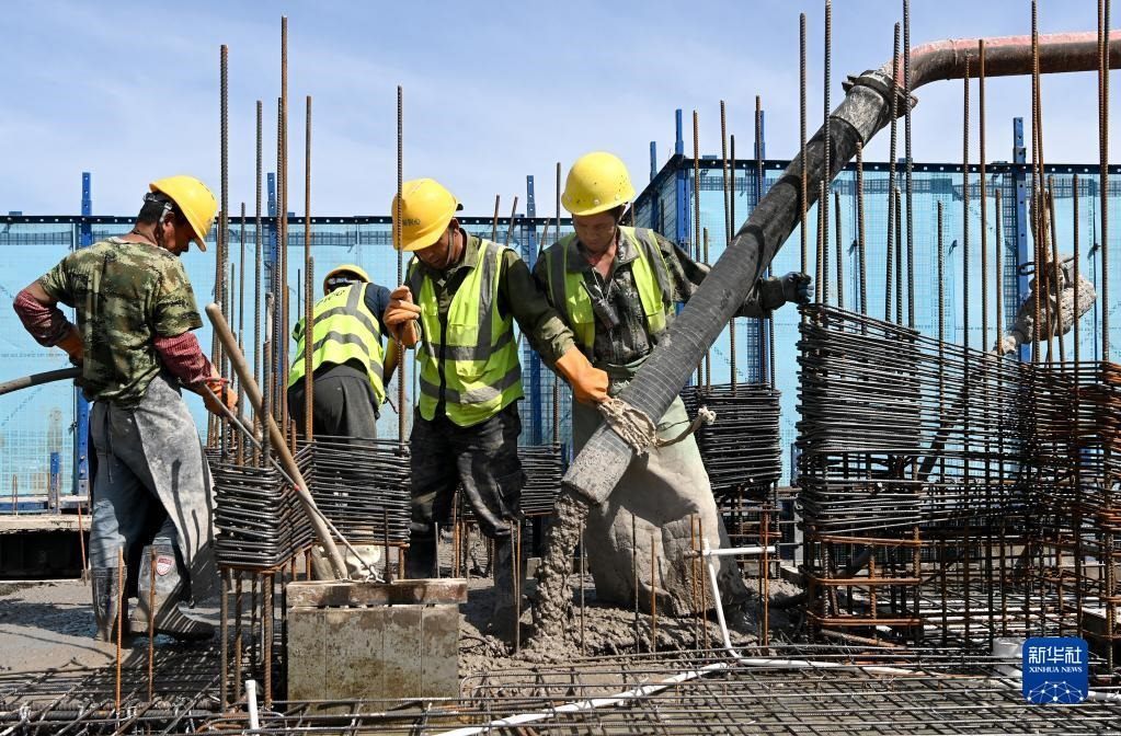 5月1日,在浙江省杭州市臨平區(qū)一個(gè)項(xiàng)目工地,中建三局的建設(shè)者在施工中。