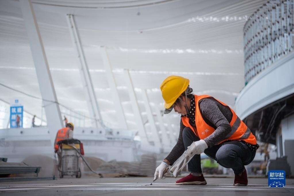 5月1日,在中建三局承建的武漢天河機(jī)場(chǎng)T2航站樓改造工程項(xiàng)目工地,工人在進(jìn)行樓地面施工作業(yè)。