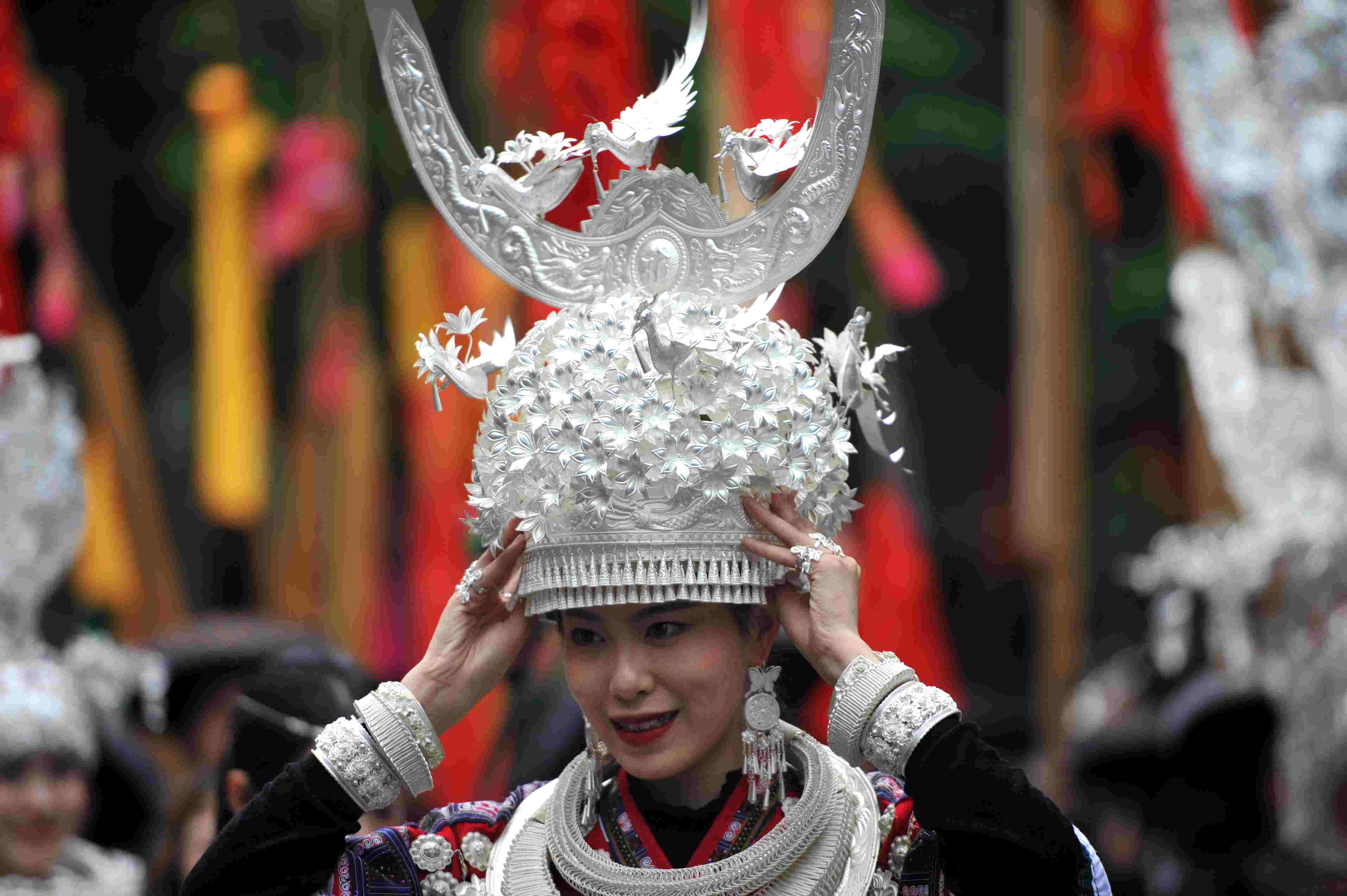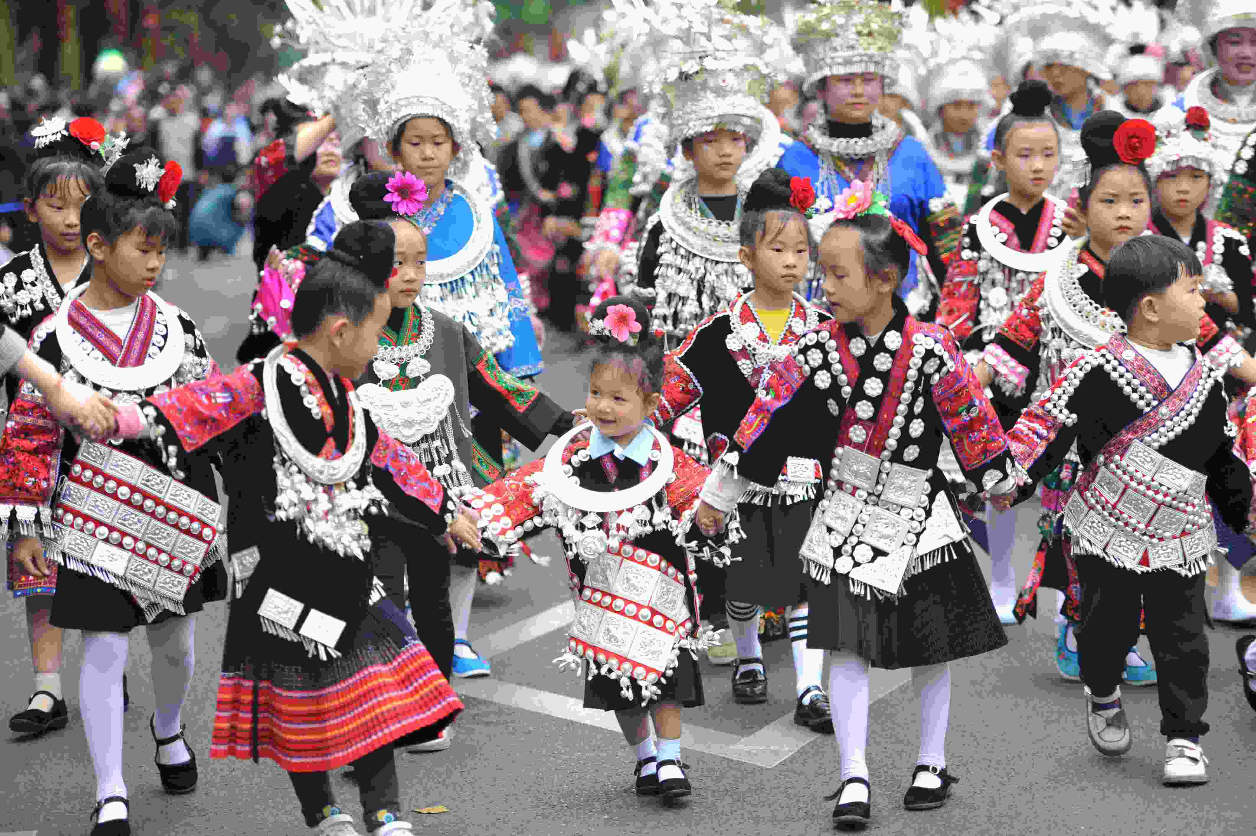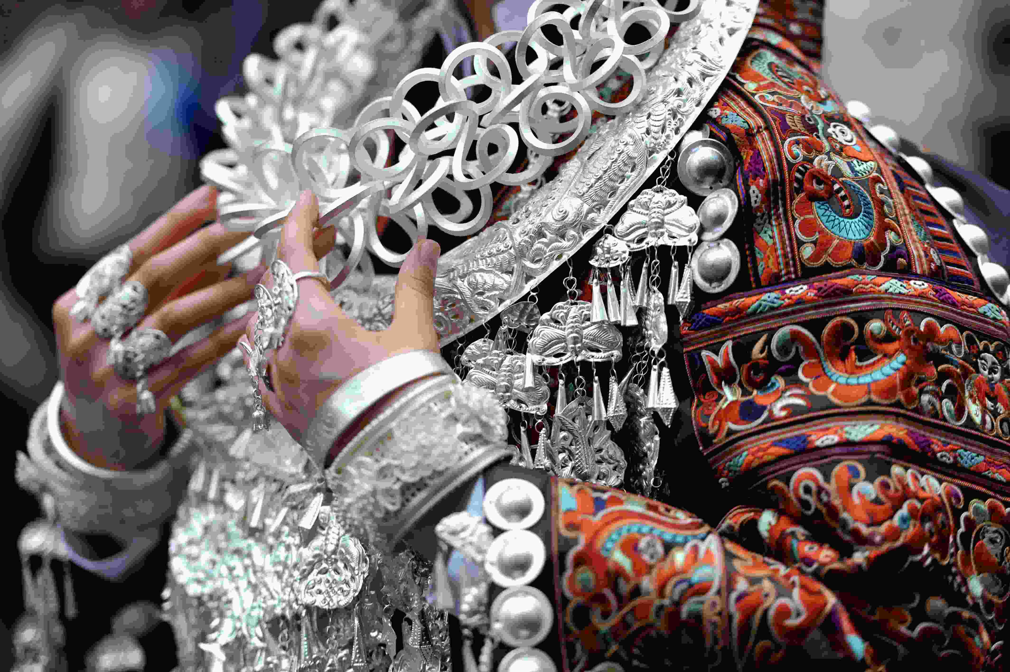 貴州省臺江縣苗族文化豐富多彩厚重,其服飾是苗族文化的重要載體,苗族女子服飾以靚麗的銀飾、精美的刺繡和獨(dú)特的審美文化內(nèi)涵而被稱為“穿在身上的史書”,成為識別苗族9大支系的重要標(biāo)識,具有極高的藝術(shù)、觀賞和收藏價(jià)值。 (寧堅(jiān))