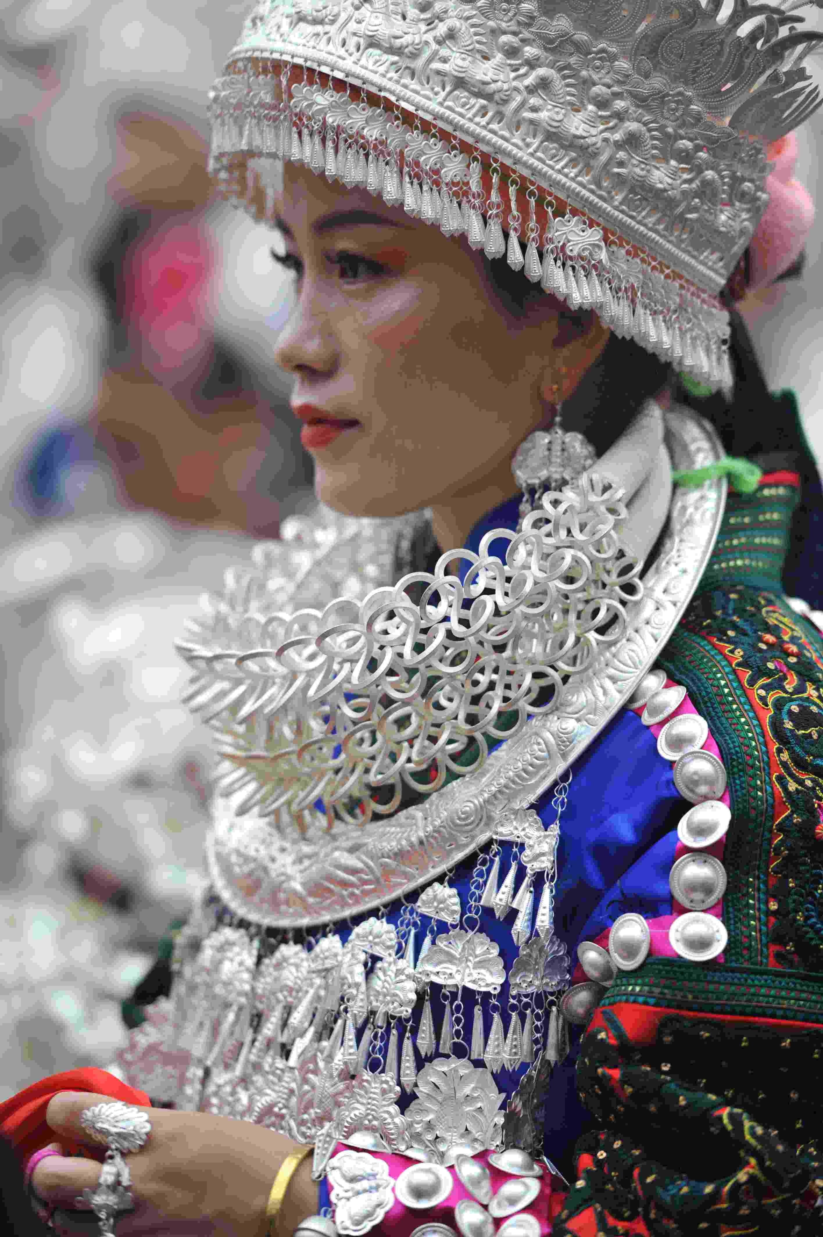 2023年5月2日,貴州省臺江縣,苗族女子盛裝參加“姊妹節(jié)”游演。