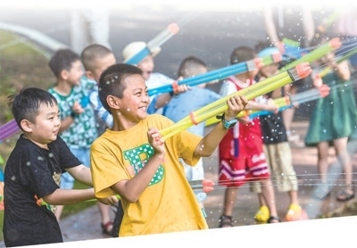 安徽省蕪湖市孫村鎮(zhèn)一家鄉(xiāng)村房車露營地里,小朋友們?cè)陂_心地打水仗。肖本祥攝(人民視覺)