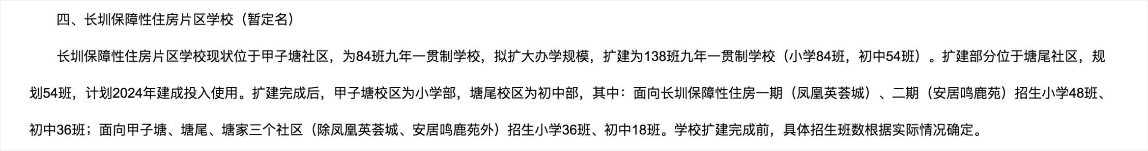 根據(jù)最新的學(xué)區(qū)劃分方案,長圳保障性住房片區(qū)學(xué)?,F(xiàn)狀位于甲子塘社區(qū),為84班九年一貫制學(xué)校,擬擴(kuò)大辦學(xué)規(guī)模,擴(kuò)建為138班九年一貫制學(xué)校(小學(xué)84班,初中54班)。擴(kuò)建部分位于塘尾社區(qū),規(guī)劃54班,計劃2024年建成投入使用。擴(kuò)建完成后,甲子塘校區(qū)為小學(xué)部,塘尾校區(qū)為初中部,其中:面向長圳保障性住房一期(鳳凰英薈城)、二期(安居鳴鹿苑)招生小學(xué)48班、初中36班;面向甲子塘、塘尾、塘家三個社區(qū)(除鳳凰英薈城、安居鳴鹿苑外)招生小學(xué)36班、初中18班。