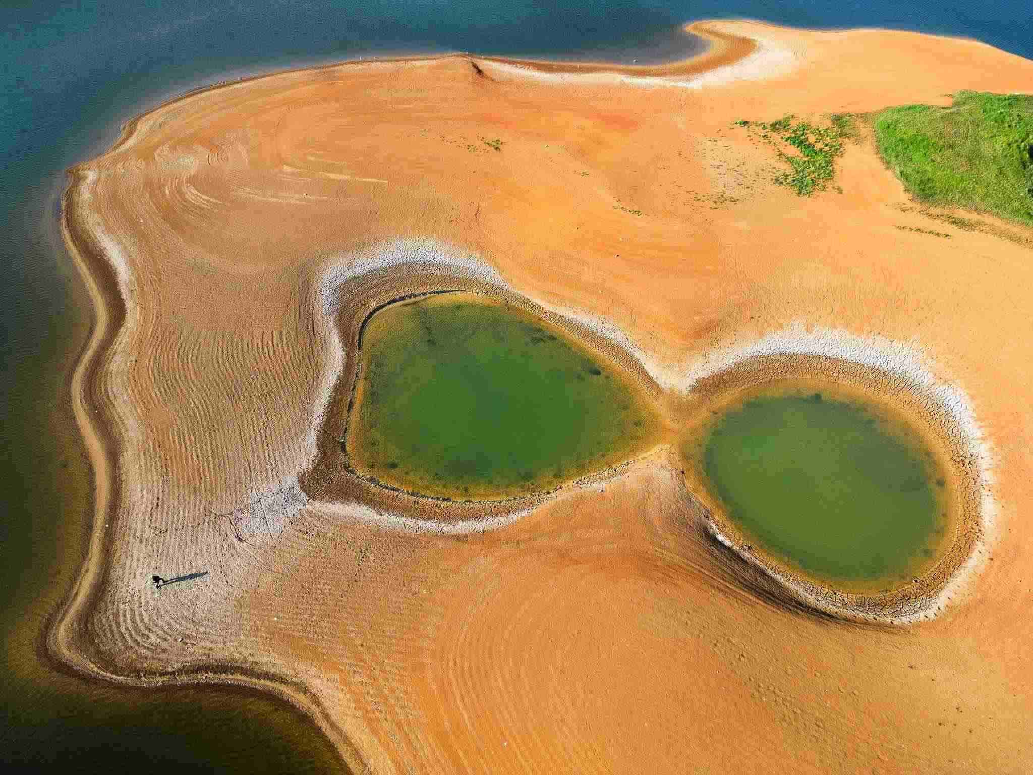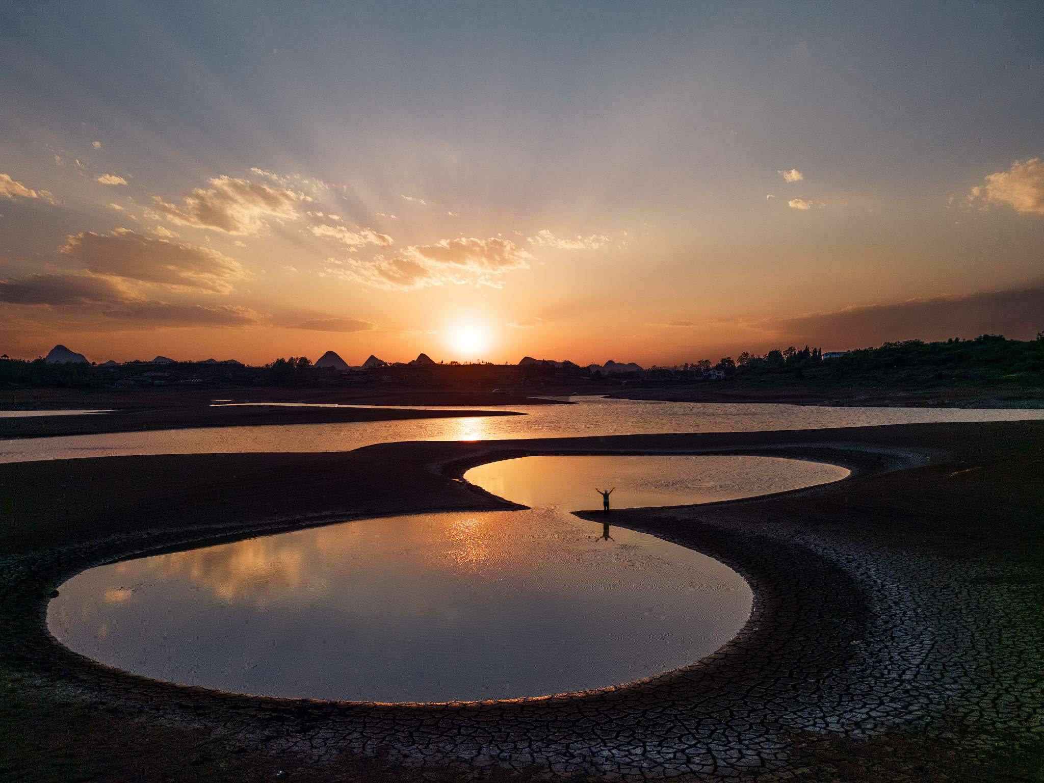 2023年5月2日,貴陽,紅楓湖水位線下降,湖底大面積裸露,猶如水上丹霞。