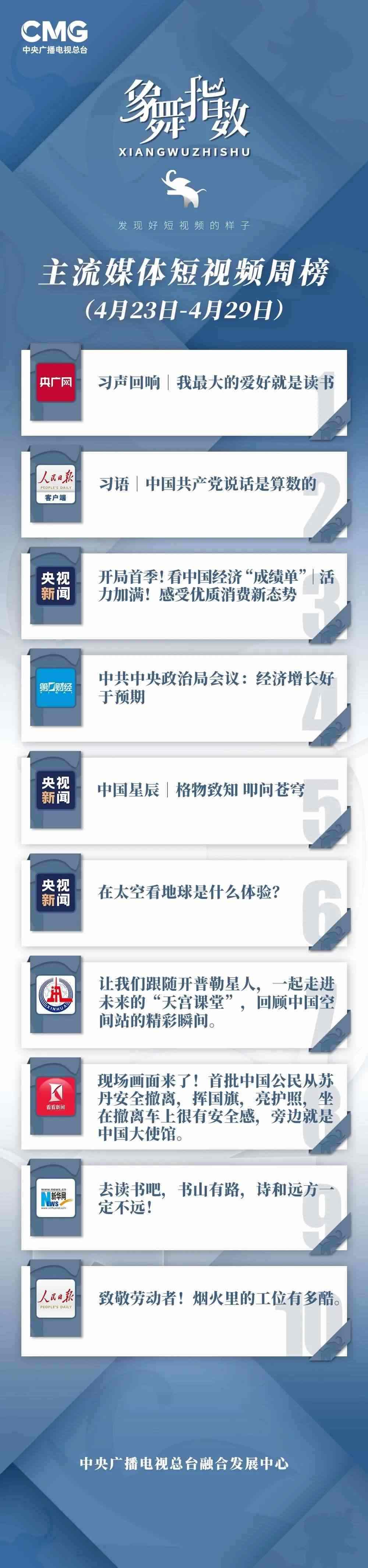 中央廣播電視總臺(tái)“象舞指數(shù)”評(píng)議品牌,推出主流媒體短視頻周榜、總臺(tái)短視頻周榜。在2023年4月23日—4月29日,這些內(nèi)容引發(fā)大眾關(guān)注: