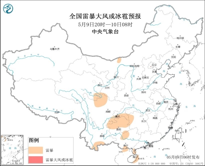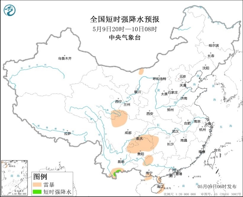 預(yù)計5月9日08時至10日08時,云南西南部、海南島東北部和西南部等地的部分地區(qū)將有短時強降水天氣,小時雨量20-30毫米,局地可達50毫米以上;另外,云南西南部局地將有雷暴大風(fēng)或冰雹天氣。