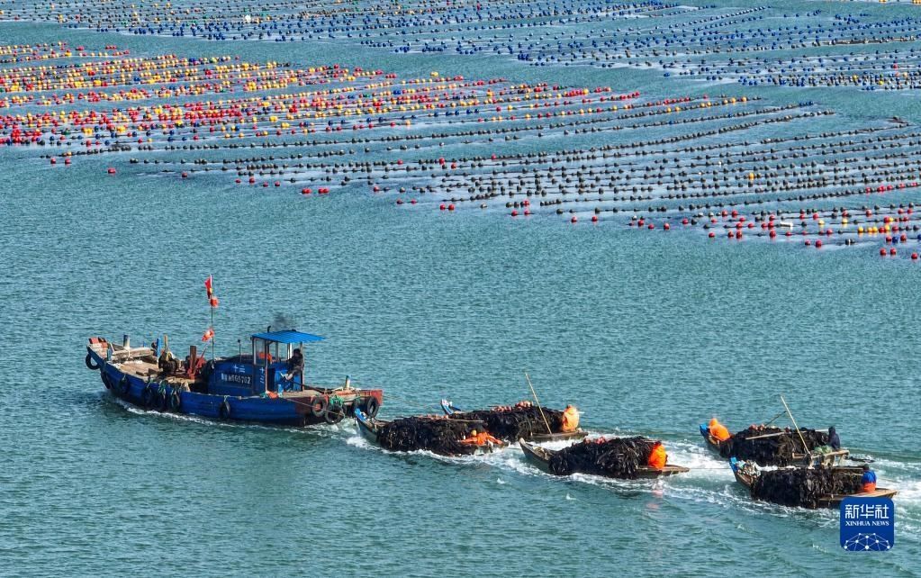 5月8日,在山東省榮成市愛倫灣海域海帶養(yǎng)殖區(qū),漁民采收海帶(無人機照片)。