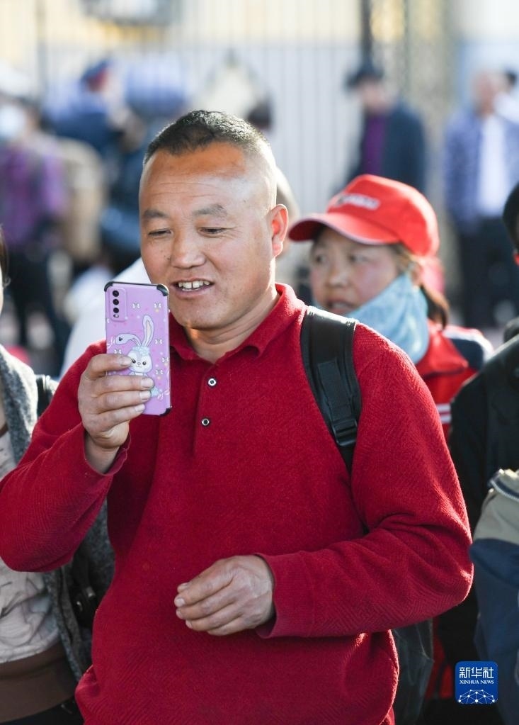 在綏化火車站站臺,乘客在等候K5151次列車時與親友視頻通話(5月6日攝)。