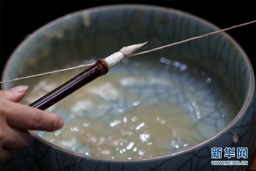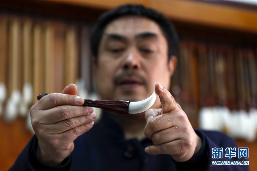 一支好的徽筆,不僅要保留傳統(tǒng)工藝,且要在原基礎(chǔ)上不斷創(chuàng)新、改良。楊文尤其重視書畫家對筆的使用反饋:“因為他們對用筆最挑剔,而且現(xiàn)代書畫家創(chuàng)作方式和作品不斷創(chuàng)新,對毛筆也有新的要求,他們提出的要求我總是盡力去滿足,也使得制筆技藝進(jìn)一步得到了提高?!? 新華網(wǎng)發(fā)(施亞磊 攝)