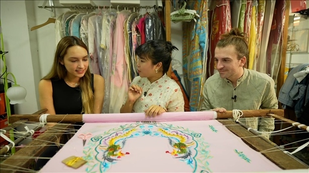 “老板,我是來做戲服模特”“我來考察非遺文化項(xiàng)目”美國的潘明花和意大利徐天佑一起來到狀元坊戲服工廠,戲服刺繡傳承人何鳳婷熱情地講述著戲服刺繡的歷史、制作工序、角色樣式,也讓他們親自體驗(yàn)了刺繡。潘明花驚嘆于刺繡工藝遠(yuǎn)比想象中要復(fù)雜得多。他們穿著戲服走近粵劇博物館,深入了解以粵劇為代表的嶺南文化。徐天佑表示戲服刺繡非遺的傳承不僅是技術(shù)工藝的傳承,同時也是文化的傳承。何鳳婷說如何讓更多年輕人喜愛和關(guān)注這項(xiàng)手藝,如何能繼續(xù)傳承下去是目前亟待解決的問題。為了讓刺繡與現(xiàn)代審美相結(jié)合,老板將刺繡工藝與年輕人喜愛的IP玩偶組合,將“激活非遺+創(chuàng)新思路+文化傳承”理念融入到刺繡中,讓這門手藝更面向大眾,推動非遺的創(chuàng)造性轉(zhuǎn)化,提高與現(xiàn)代生活的緊密度,成為融入現(xiàn)代生活中的潮流元素,讓非遺重?zé)ü獠省?/p>