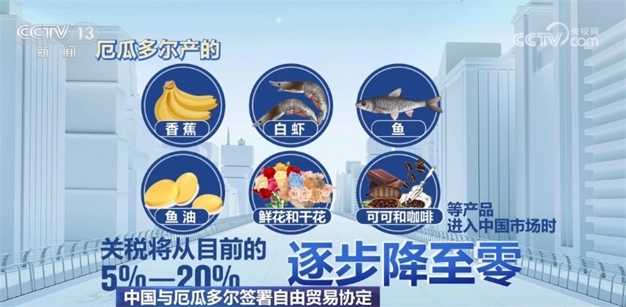 中方實施零關稅的產品將全面覆蓋厄瓜多爾的主要出口產品。協(xié)定生效后,厄瓜多爾產的香蕉、白蝦、魚、魚油、鮮花和干花、可可和咖啡等產品進入中國市場時,關稅將從目前的5%—20%逐步降至零。