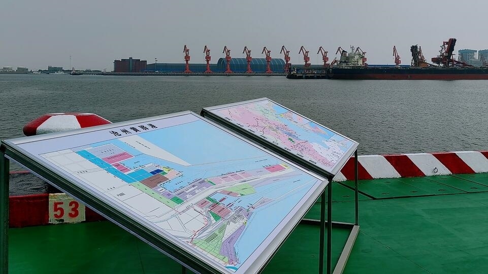△位于渤海灣穹頂處的滄州黃驊港。(總臺(tái)央視記者張曉鵬拍攝)