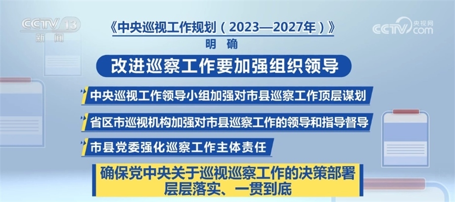 《中央巡視工作規(guī)劃(2023—2027年)》明確,改進巡察工作要加強組織領(lǐng)導(dǎo)。中央巡視工作領(lǐng)導(dǎo)小組加強對市縣巡察工作頂層謀劃,省區(qū)市巡視機構(gòu)加強對市縣巡察工作的領(lǐng)導(dǎo)和指導(dǎo)督導(dǎo),市縣黨委強化巡察工作主體責(zé)任,確保黨中央關(guān)于巡視巡察工作的決策部署層層落實、一貫到底。