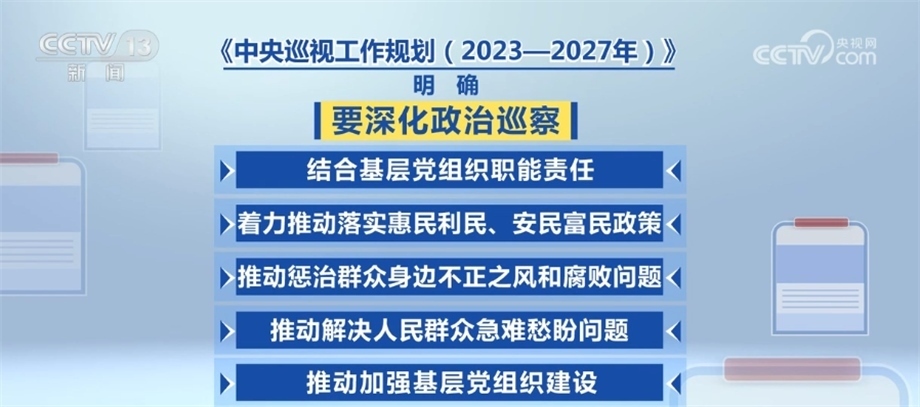 央視網(wǎng)消息:近日,經(jīng)黨中央同意,中共中央辦公廳印發(fā)了《中央巡視工作規(guī)劃(2023—2027年)》,對今后5年的巡視工作作出了部署。一屆任期內(nèi)實現(xiàn)巡視全覆蓋,是黨章規(guī)定的政治任務(wù)。通過什么樣的方式實現(xiàn)二十屆中央巡視全覆蓋?采取哪些措施高質(zhì)量推進巡視全覆蓋?在此次印發(fā)的巡視工作規(guī)劃中都作出了要求。