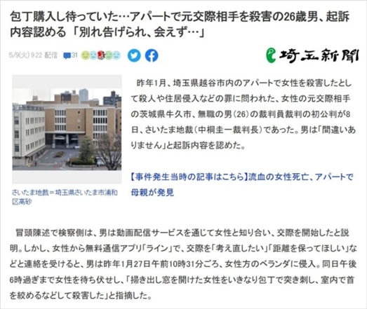 ·日本茨城縣牛久市一名26歲失業(yè)男子因不滿女友提分手,潛入女方家陽(yáng)臺(tái)蹲守近8小時(shí),等她出來收衣服時(shí)將其殺害。
