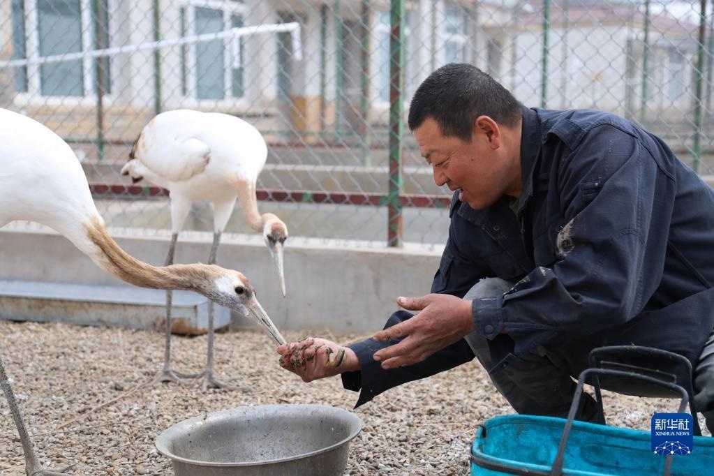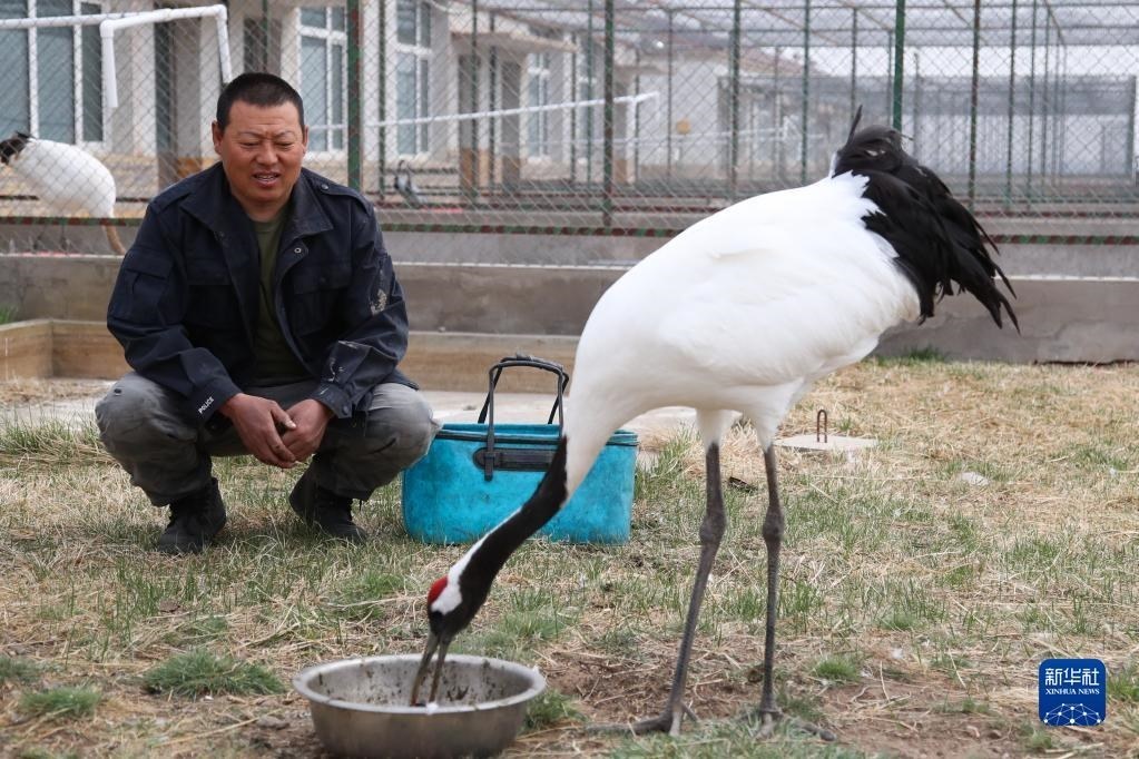 5月11日,徐沃德樂胡在觀察救助的丹頂鶴進(jìn)食。