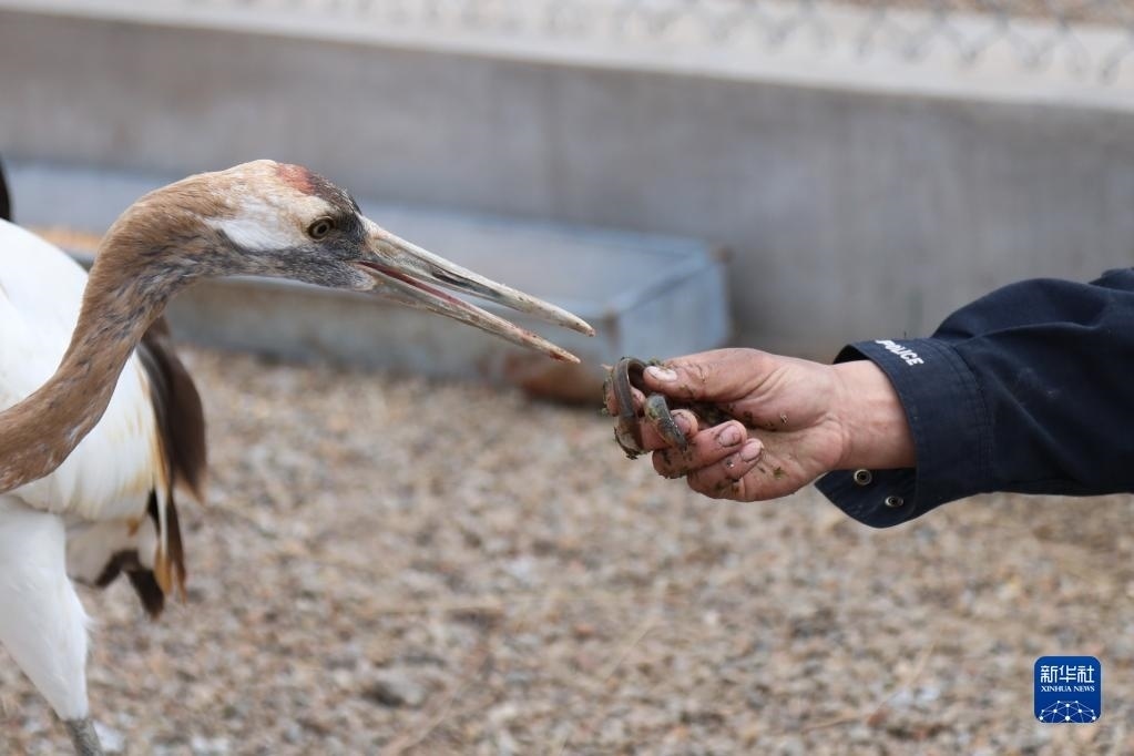 5月11日,徐沃德樂胡給救助的丹頂鶴喂食。
