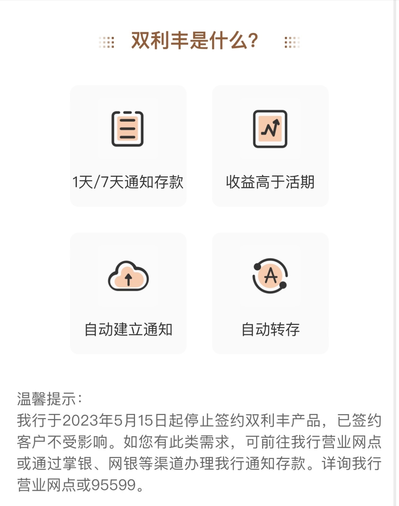 農(nóng)業(yè)銀行App顯示,該行存款專(zhuān)區(qū)中的智能通知存款產(chǎn)品“雙利豐”于5月15日起停止簽約,已簽約客戶(hù)不受影響。農(nóng)行表示,如有此類(lèi)需求,可前往營(yíng)業(yè)網(wǎng)點(diǎn)或通過(guò)掌銀、網(wǎng)銀等渠道辦理通知存款。