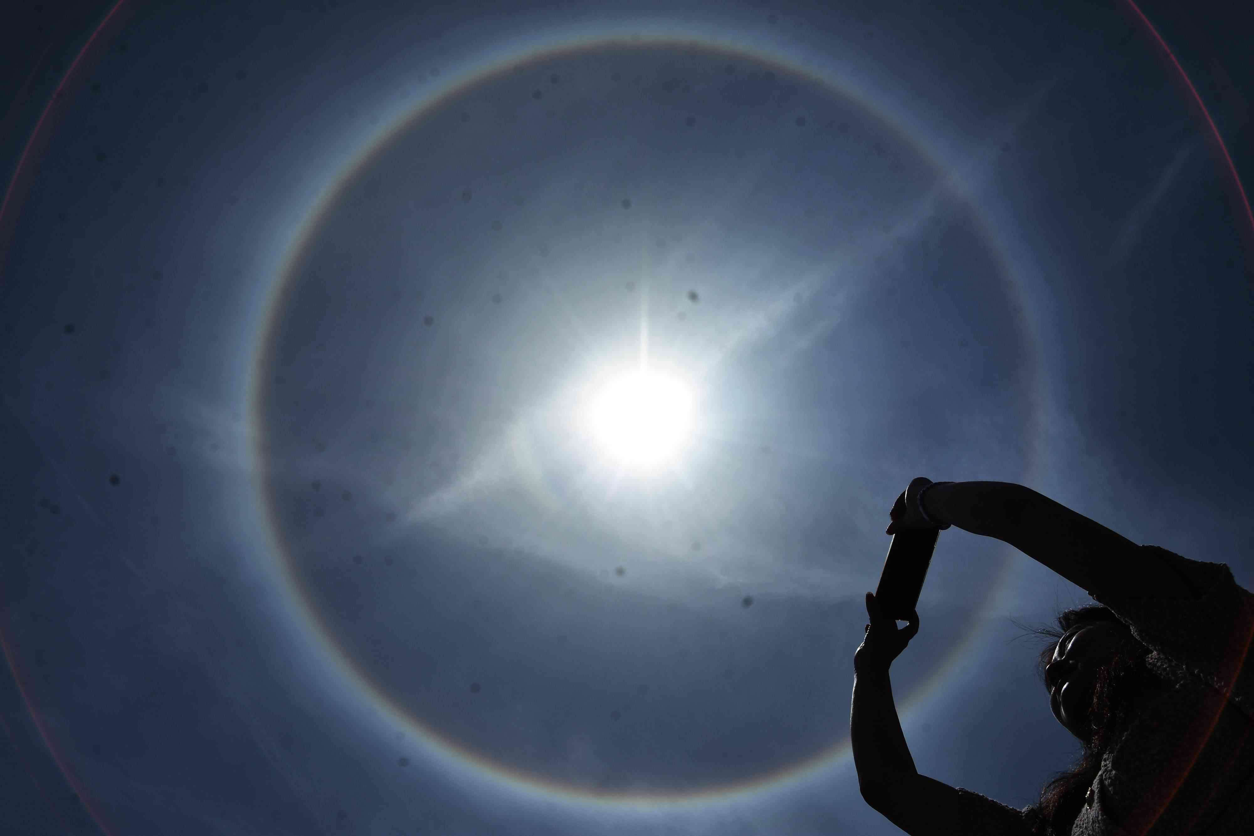 2023年5月15日中午,湖北宜昌,天空出現(xiàn)日暈景觀。當(dāng)日,多地天空出現(xiàn)日暈。日暈是一種大氣光學(xué)現(xiàn)象,是太陽(yáng)光通過云層中的冰晶折射或反射而形成的。 視覺中國(guó)