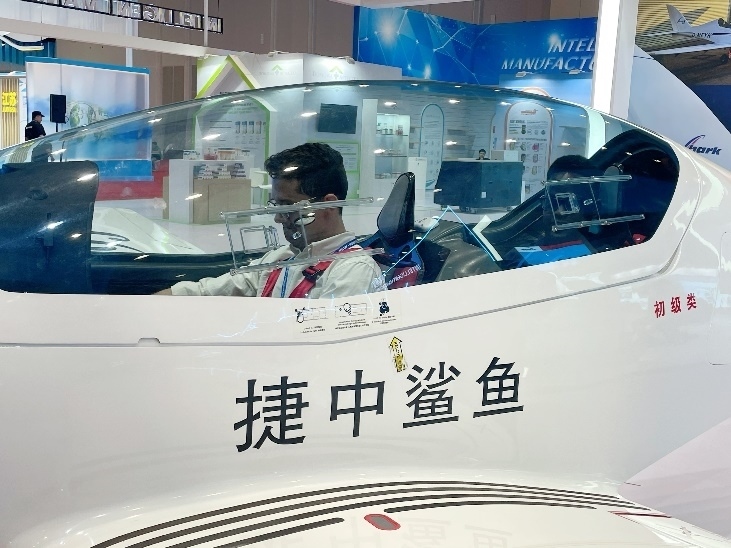 采訪團(tuán)成員在展會(huì)體驗(yàn)“鯊魚(yú)飛機(jī)”