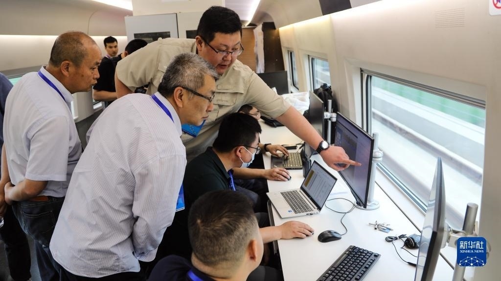 5月16日,在高速綜合檢測列車上,聯調聯試工作人員在分析測試數據。