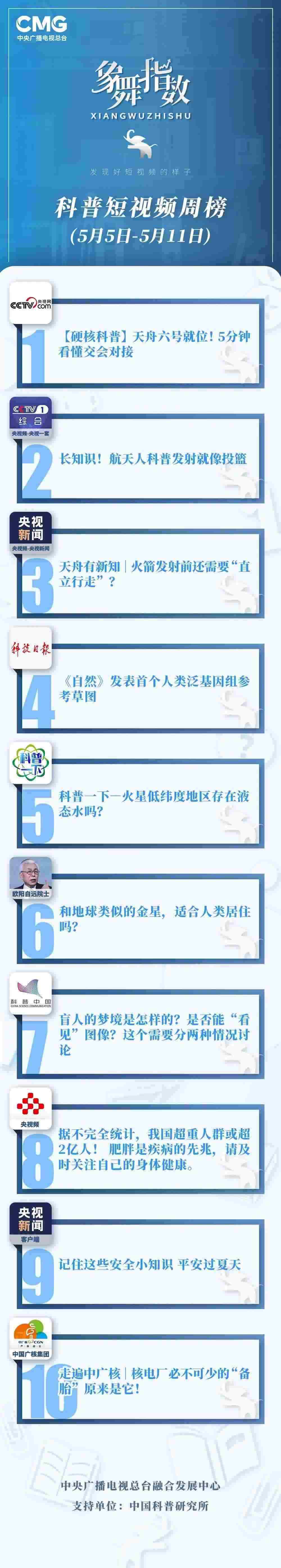 中央廣播電視總臺(tái)“象舞指數(shù)”評(píng)議品牌,推出科普短視頻周榜、總臺(tái)科普短視頻周榜。在2023年5月5日-5月11日,值得注目的內(nèi)容有: