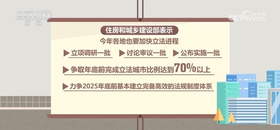 住房城鄉(xiāng)建設部表示,2023年,各地也要加快立法進程,立項調研一批、討論審議一批、公布實施一批,爭取年底前完成立法城市比例達到70%以上,力爭2025年底前基本建立完備高效的法規(guī)制度體系。