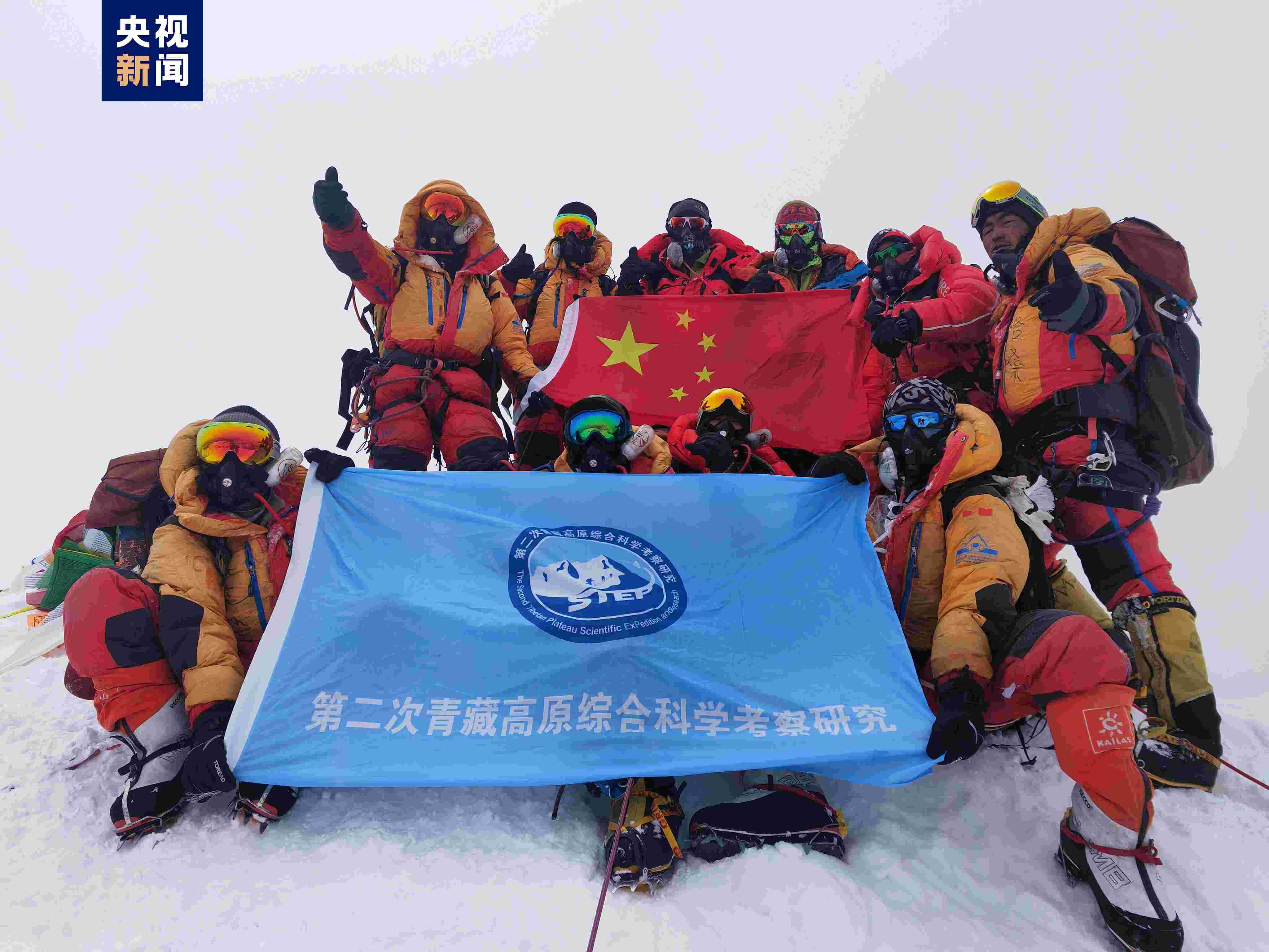 5月23日上午,2023“巔峰使命”珠峰科考登頂隊(duì)員在珠峰峰頂展示第二次青藏高原綜合科學(xué)考察研究隊(duì)隊(duì)旗。