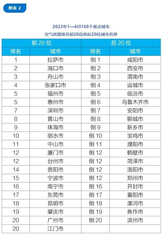 1—4月,168個(gè)重點(diǎn)城市中,拉薩、海口和舟山等城市空氣質(zhì)量相對(duì)較好(從第1名至并列第20名);咸陽(yáng)、西安和渭南等城市空氣質(zhì)量相對(duì)較差(從倒數(shù)第1名至倒數(shù)第20名)。