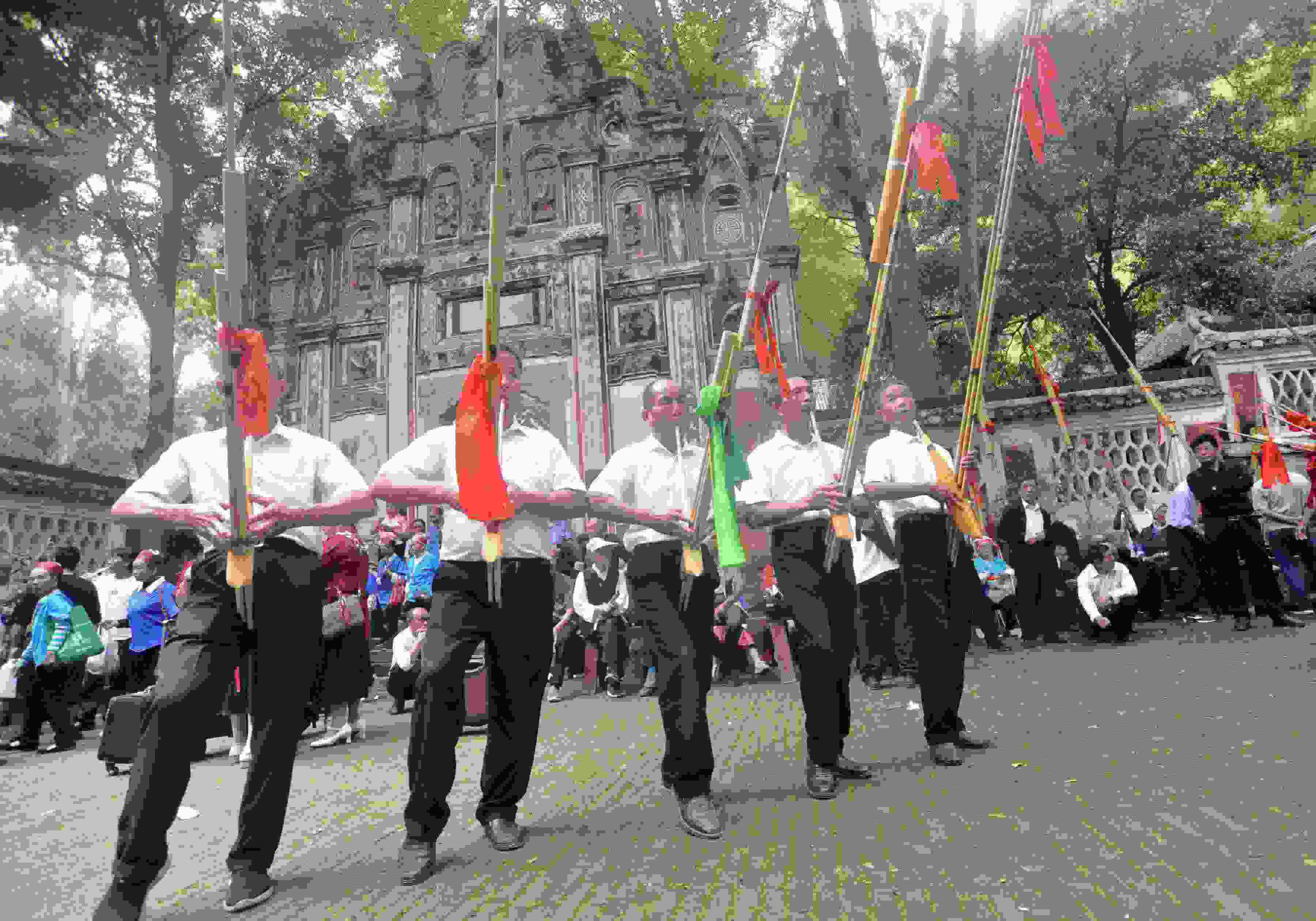 2023年5月26日,苗族同胞在貴州省黃平縣飛云崖景區(qū)給來賓敬攔門酒。當日是農(nóng)歷四月初八,貴州省黔東南苗族侗族自治州黃平縣一年一度的苗族“四月八”系列活動拉開帷幕。苗族同胞身著盛裝開展吹蘆笙、踩鼓舞、對唱苗歌等系列民俗活動,并展示了泥哨、刺繡、銀飾及蠟染等非物質(zhì)文化遺產(chǎn)技藝,吸引了眾多游客。(寧堅 楊忠)