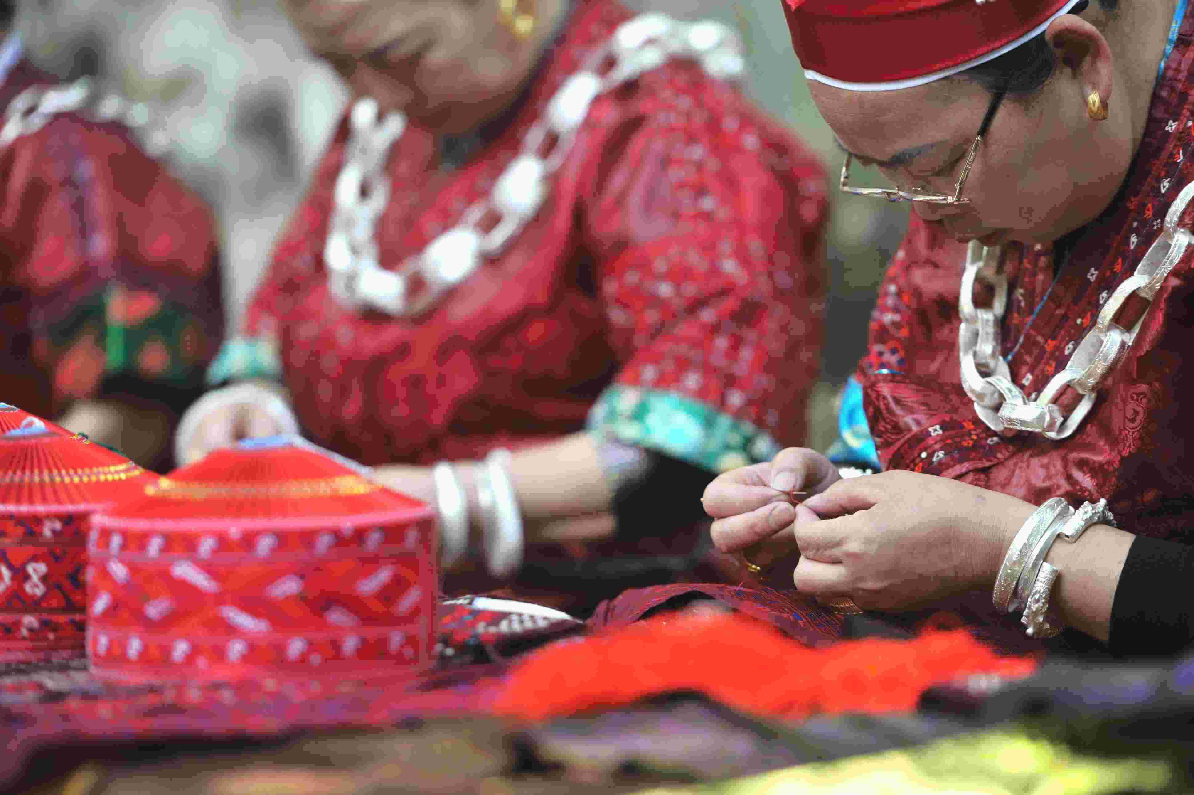 2023年5月26日,民間藝人在貴州省黃平縣飛云崖景區(qū)展示傳統(tǒng)刺繡技藝。 (寧堅 楊忠)