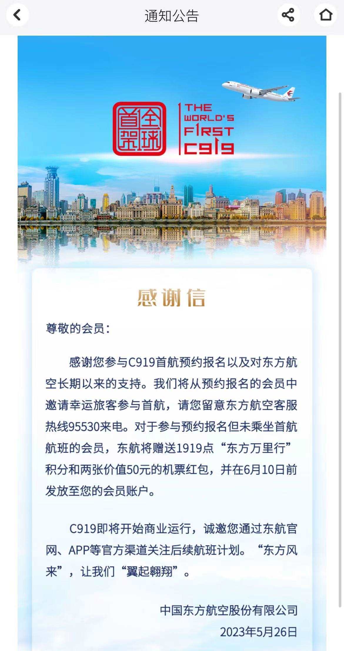 東航APP上還發(fā)布了一則感謝信,信中表示,C919即將開始商業(yè)運行,東航將從預(yù)約報名的會員中邀請幸運旅客參與首航,對于參與預(yù)約報名但未乘坐首航航班的會員,東航將贈送1919點“東方萬里行”積分和兩張價值50元的機票紅包,并在6月10日前發(fā)放至?xí)T賬戶。