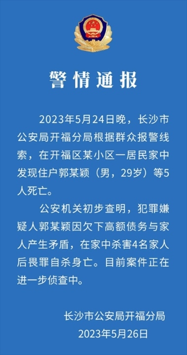 ·警方通報長沙某小區(qū)房內(nèi)發(fā)現(xiàn)5具尸體:男子殺害4名家人后畏罪自殺。