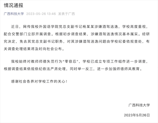 ·廣西科大通報學(xué)院副書記涉酒駕逃逸:免職,學(xué)校紀委介入。