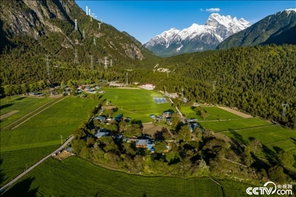 2023年5月24日,西藏林芝,波密縣松宗鎮(zhèn)龍亞村,民居、樹木和遠處的雪山相映成趣。