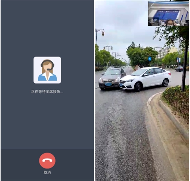 當(dāng)事人點(diǎn)擊“視頻報警”按鈕后,呼叫等待公安交管部門接警人員接聽,接警人員接聽后進(jìn)入雙方視頻通話。