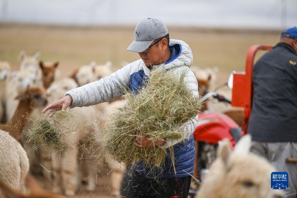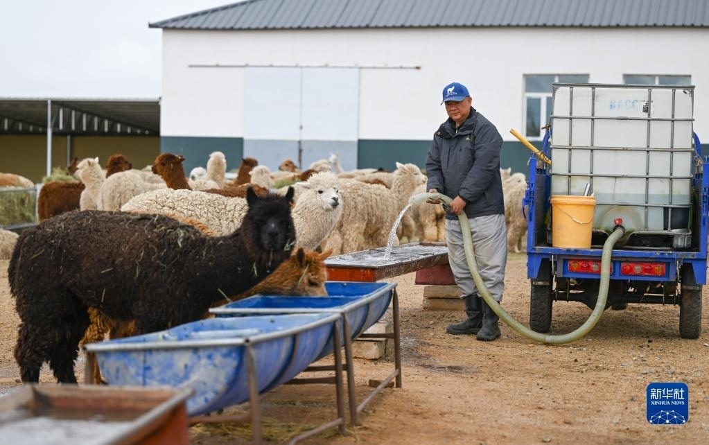 6月1日,巴彥杭蓋嘎查羊駝養(yǎng)殖基地的工作人員準備給羊駝喂食。